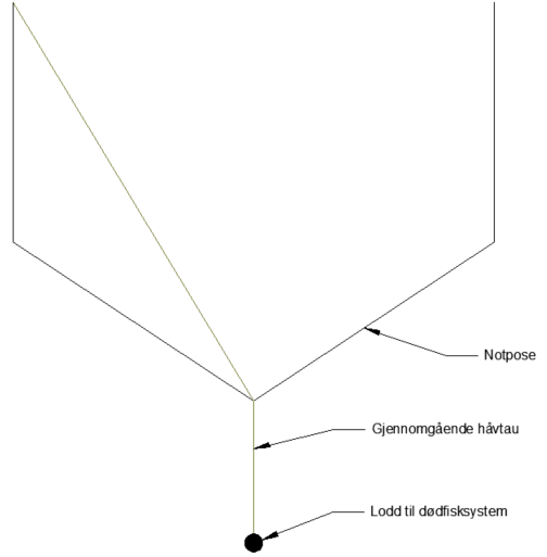 Figur 3: : Prinsippskisse av notpose med gjennomgående håvtau og lodd til dødfisksystem. Skisse: Egersund Net