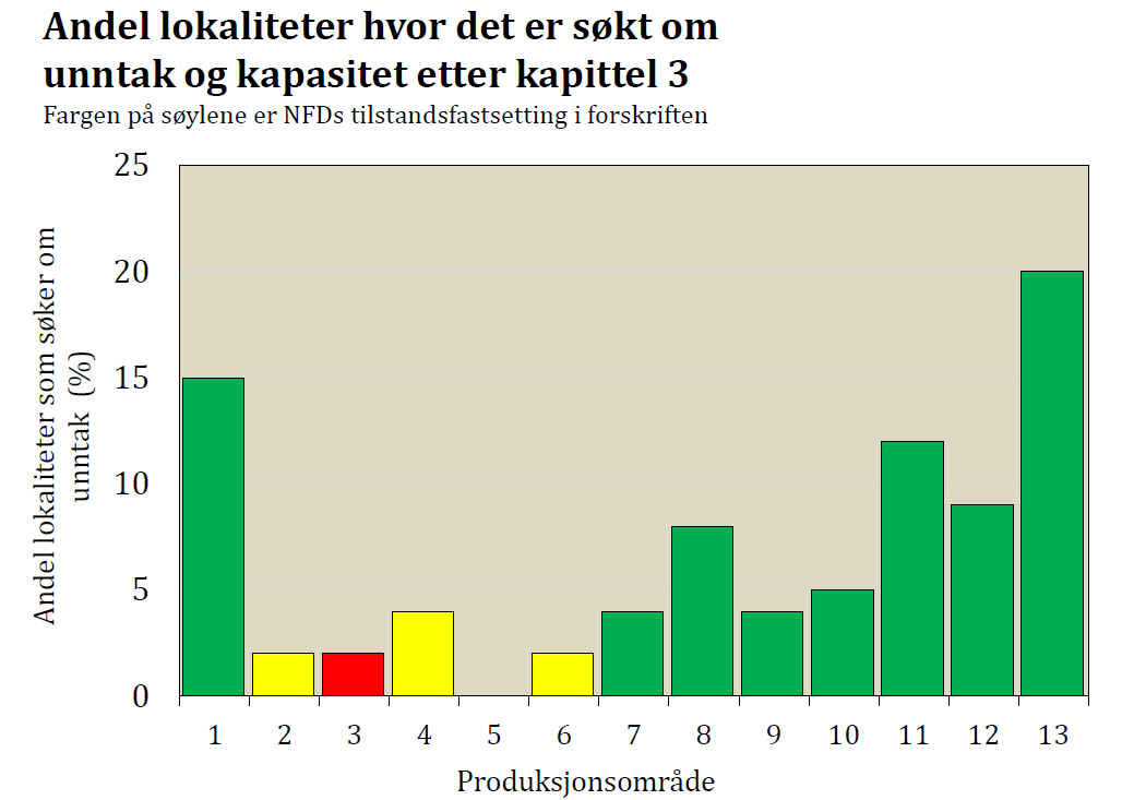 Når det gjelder unntaksregelen, kan en innehaver som oppfyller visse miljøkriterier søke om økning av produksjonskapasitet på inntil 6 prosent. Det er Mattilsynet som avgjør om innehaveren oppfyller kriteriene som er satt i § 12. Departementet har 29.01.2018 gitt en presisering av hva som forstås med «sist gjennomførte produksjonssyklus» med hensyn til medikamentell behandling mot lakselus (pdf, 255.4 kB) .