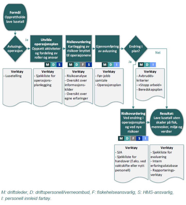 Prosessen som er vist under er en delprosess for planlegging og gjennomføring av avlusing, med aktiviteter, roller og verktøy. Merk at gjennomføring av avlusing kan utgjøre en mer detaljert delprosess som involverer flere aktører og roller enn hva som er angitt her.