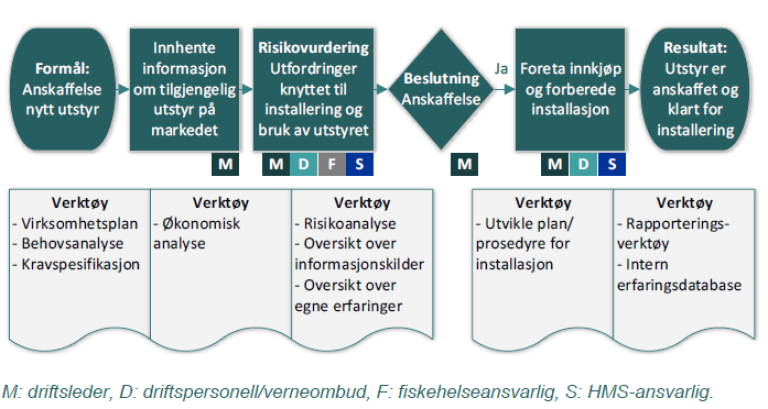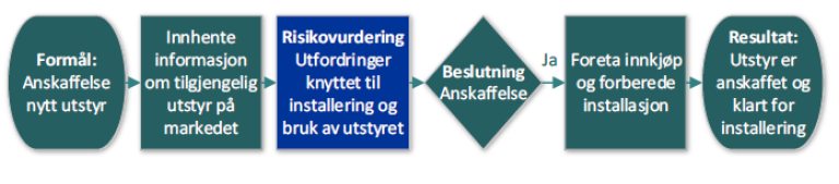 Prosessen som er vist under er en delprosess for anskaffelse av utstyr, med aktiviteter, roller og verktøy:
