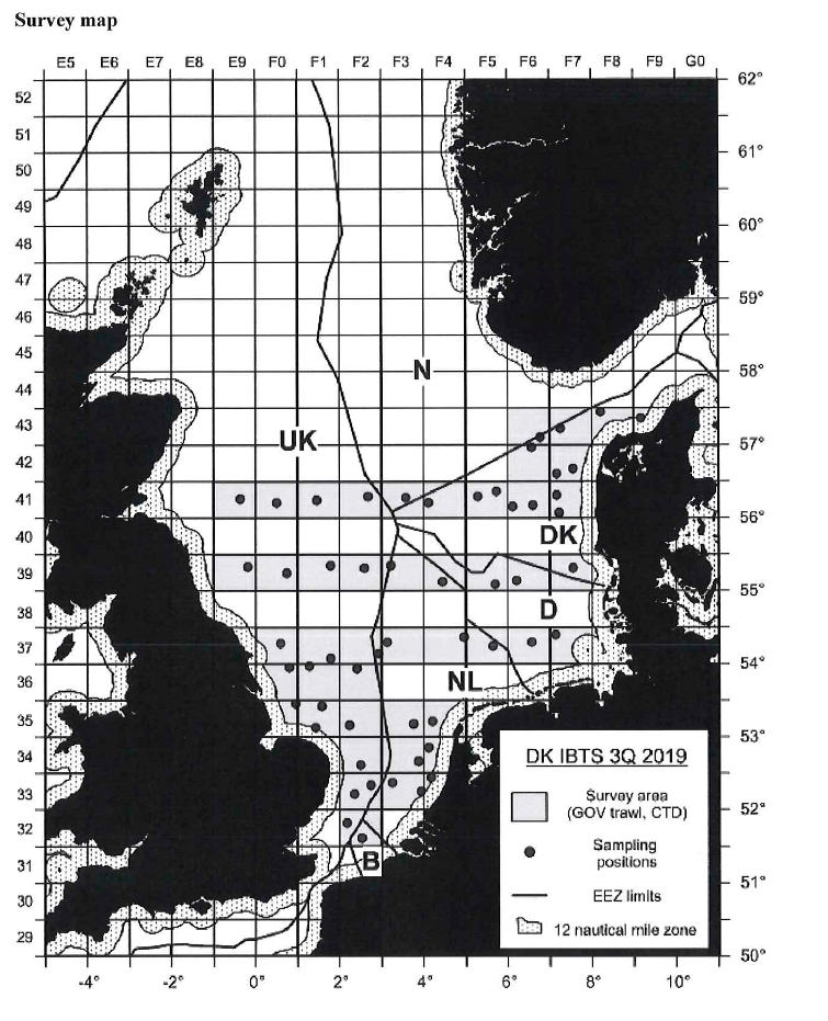 "Walther Herwig III". Bundesanstalt für Landwirtschaft und Ernährung, Hamburg, Germany, DBFR | International Bottom Trawl Survey, and German Small-scale Bottom Trawl Survey Entire North Sea between 54°N – 62°N, particularly in those rectangles assigned to Germany by ICES (see map).