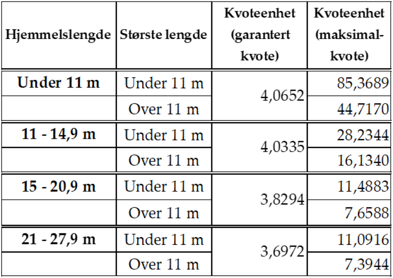 Hjemmelseslengde | Største lengde | Garantert kvoteenhet | Maksimalkvoteenhet |