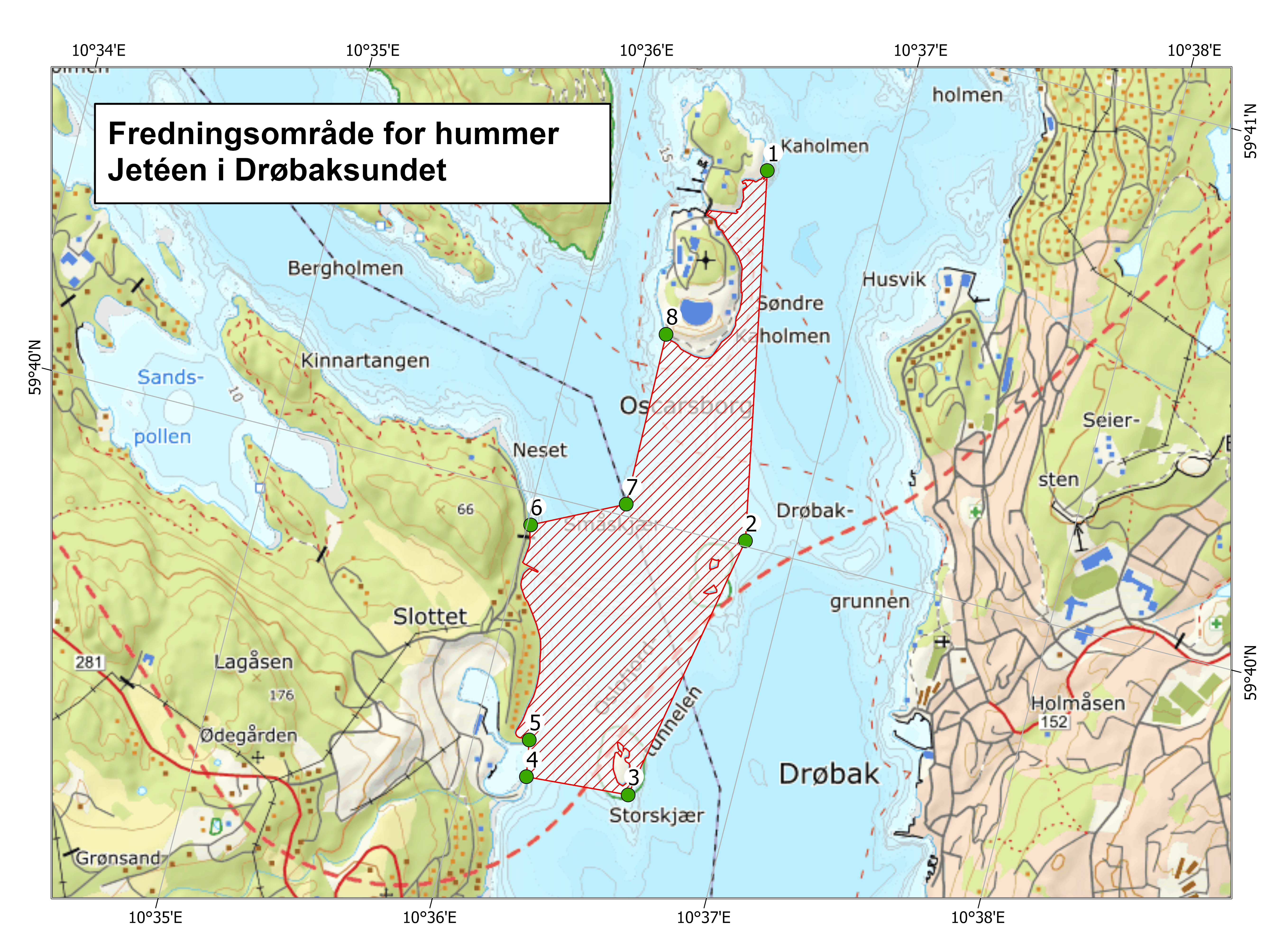 Det er forbudt å fiske med hummerteiner langs hele sjølinjen ned til 50 meters dyp regnet fra laveste vannstand i områdene avgrenset av følgende posisjoner angitt i grader og desimalminutter (jf. kartvedlegg):