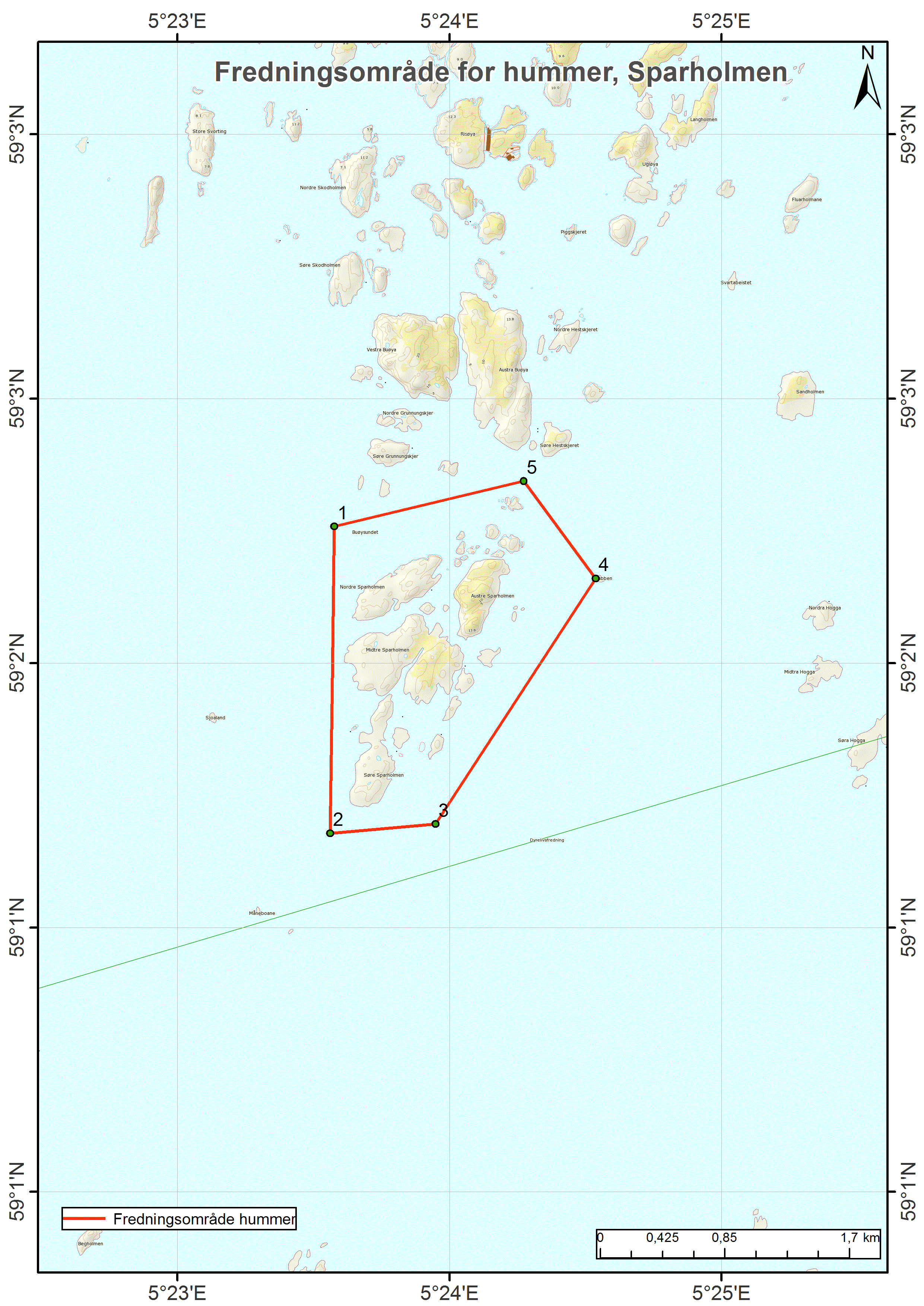 Mellom det første og det femte punktet følger grensen sjølinjen.