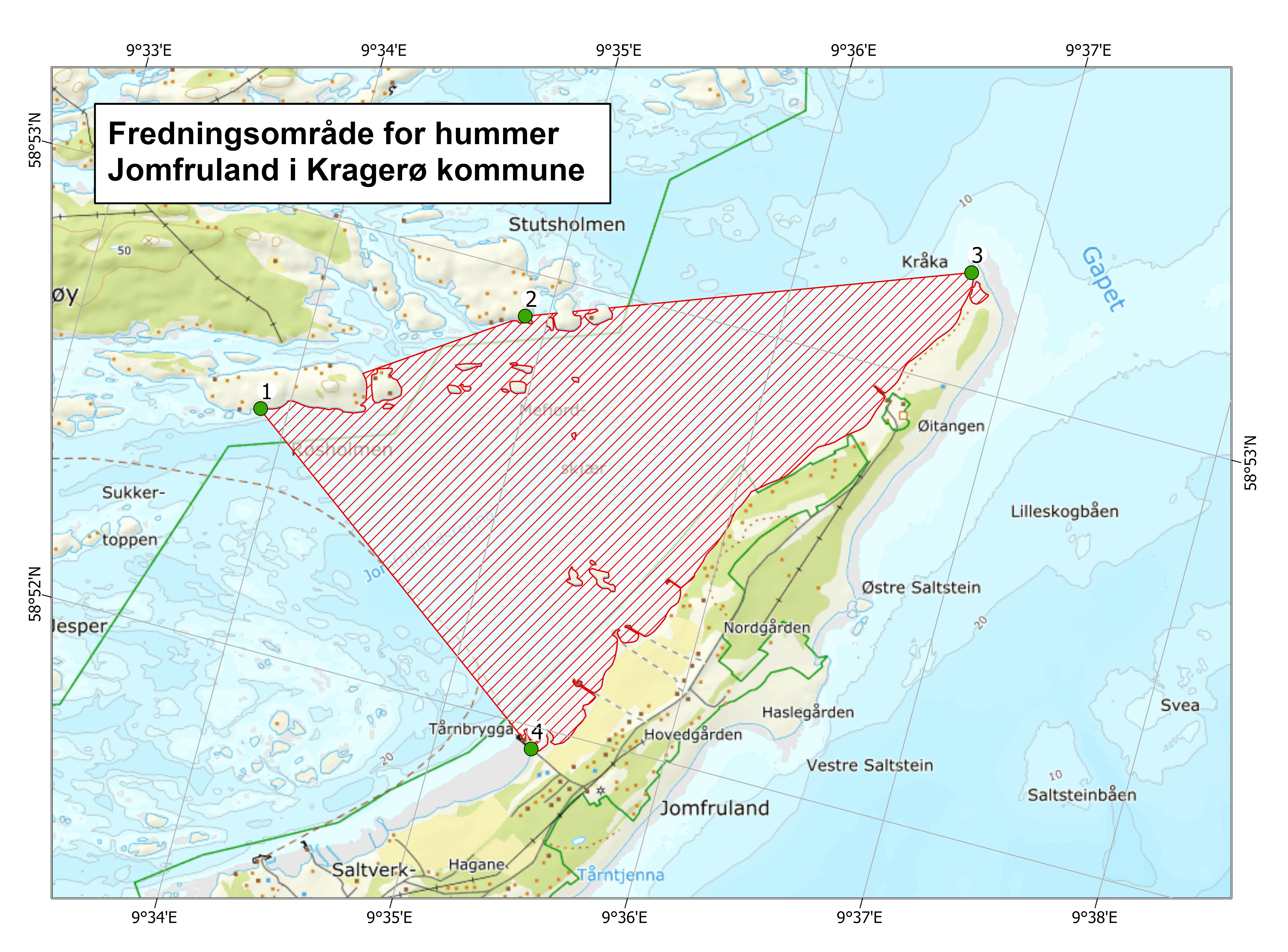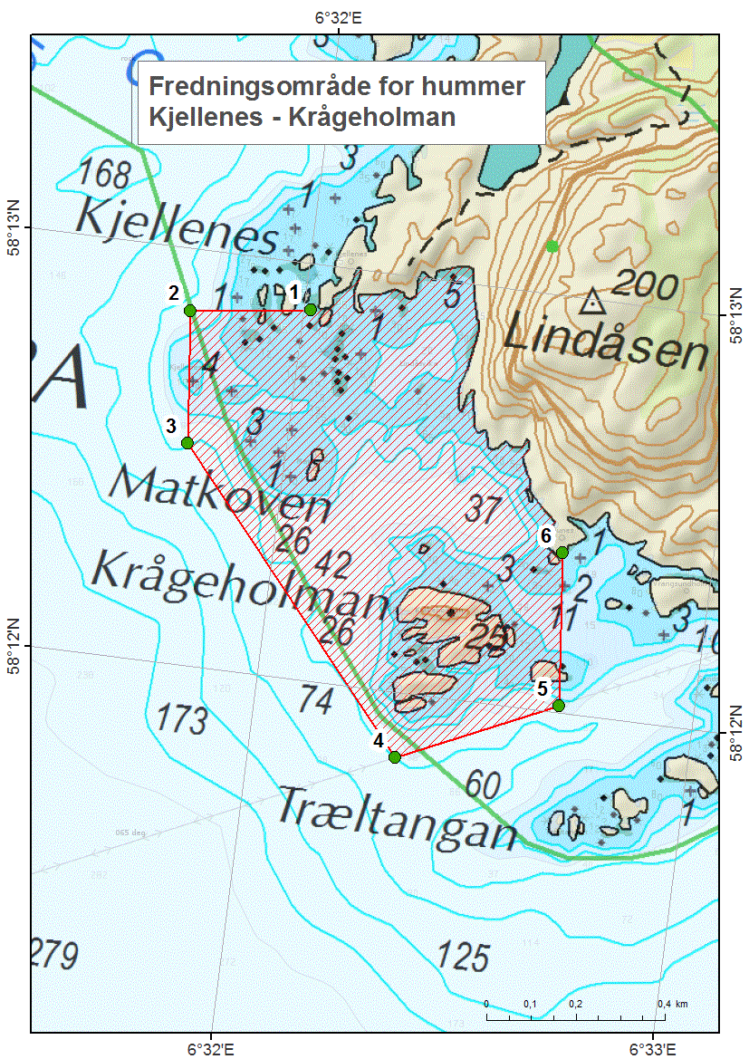 Det er forbudt å fiske med hummerteiner langs hele sjølinjen ned til 50 meters dyp regnet fra laveste vannstand i områdene avgrenset av følgende posisjoner angitt i grader og desimalminutter (jf. kartvedlegg):