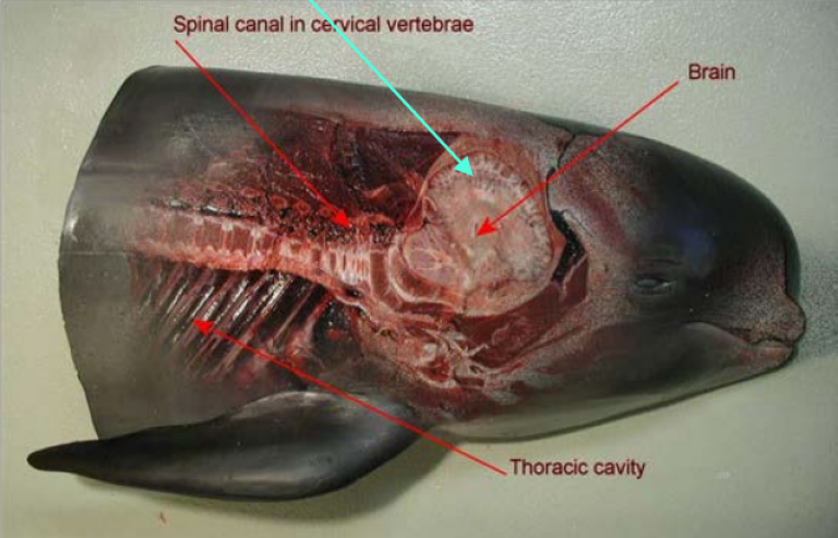 Skudd mot hjernen fra «buksiden» (ventralsiden) rettes midt mellom kjevebenene (mandiblene) mot et punkt (avhengig av størrelsen på hvalen) som ligger 30-50 cm bak øynene. Fra brystsiden kan det være vanskelig å plassere skuddet nøyaktig.